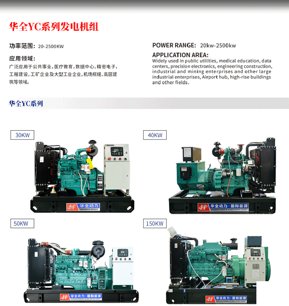 華全柴油發(fā)電機是山東華全動力股份有限公司(簡稱“華全動力”)生產(chǎn)的一系列發(fā)電設備,廣泛應用于工業(yè)、商業(yè)、農(nóng)業(yè)、建筑、應急電源等領域。